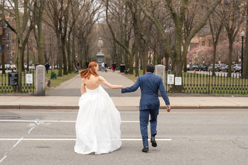 The happy couple, giddy with joy, skipped across Comm. Ave. for some photos and a champagne toast, poured into tiny red solo cups. Alyssa and Ray’s happiness was palpable and contagious (in a good way!) as they walked around for photos, saying thank you to strangers calling out their congratulations. Eventually we ended our session with the happy couple walking back to the Gardens, canopied under Boston’s classic pink flower trees.